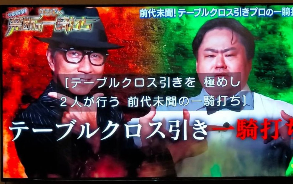 | 2025 8/23(土)21:00-23:10 フジテレビ 土曜プレミアム「今夜解禁!サンドの禁断の一騎打ち」 「テーブルクロス引き!これ出来んのか?対決」 ダンディGO×ウエスP ![]() |